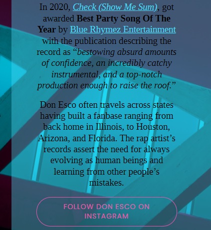 In the image above you have a snippet of Don Esco’s professional biography that you can read in its entirety on his website. What Don Esco did was leverage the review and award he had with us in 2020 to give a significant boost to his track record and artist accomplishments that are a MUST component of any professional biography. If you have any press that is quotable, include the best lines in your bio. Let the media do the talking and sing your praises for you.